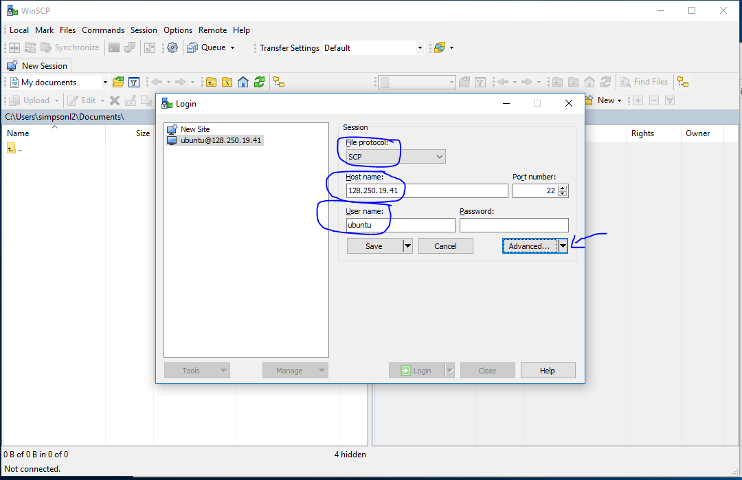 When you start, you will see this screen. Fill out the details, drop down the menu to choose SCP, put in the IP address and the user name, then click the ‘Advanced’ drop down menu.